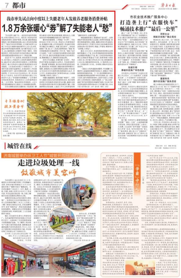 2025年7月,民政部、財政部聯(lián)合印發(fā)通知,向中度以上失能老年人發(fā)放養(yǎng)老服務(wù)消費補貼,通過中央與地方財政資金聯(lián)動,以消費券抵扣形式,重點支持老年人購買機構(gòu)或居家社區(qū)養(yǎng)老服務(wù)。山東省成為首批3個省級試點之一,濟南作為省會城市迅速響應(yīng),在省民政廳、市紀委監(jiān)委指導(dǎo)支持下,聯(lián)合市財政局第一時間出臺配套政策,于今年8月正式啟動試點工作,項目周期12個自然月,為全市符合條件的中度以上失能老年人送上“養(yǎng)老服務(wù)保障暖流”?!皬纳暾堅u估到在機構(gòu)用券,機構(gòu)和社區(qū)人員積極幫著對接,一點不費事?!碧峒跋M券申領(lǐng)使用,入住天橋區(qū)盛泉晚晴老年公寓的王大爺家屬連連稱贊。